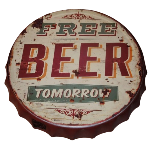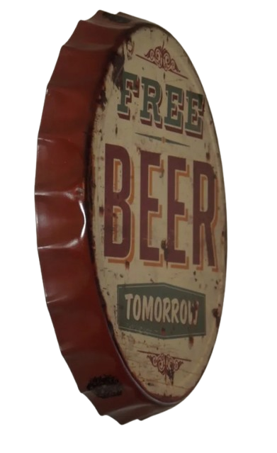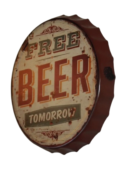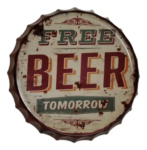 CARTEL DE CHAPA - TAPA DE CERVEZA - FREE BEER TOMORROW - ARTICULO MH103034 - PARA INTERIOR, con gancho para colgar, diametro trasero 32 cm - diametro frontal 29 cm, espesor 4 cm, peso 500 grs.