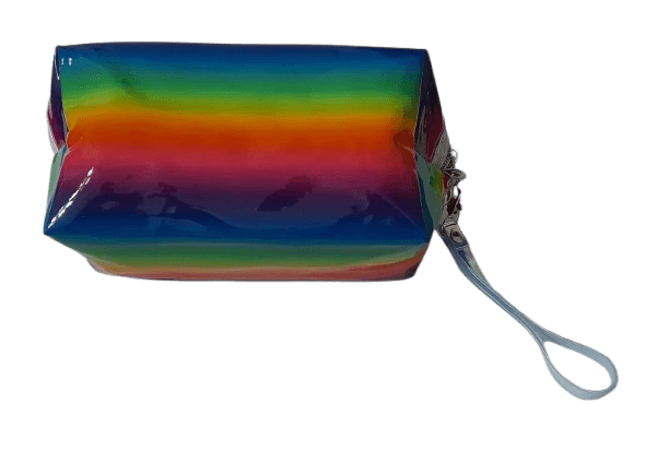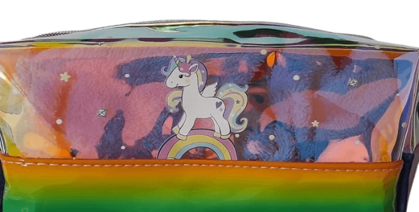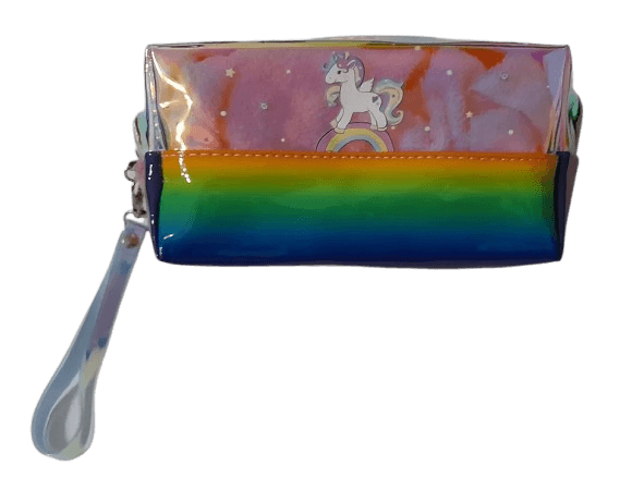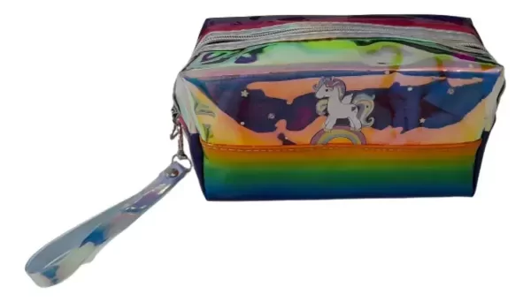 CARTUCHERA - PORTACOSMETICOS, pvc, un compartimento con cierre metalico, tira de mano tornasolada con gancho de metal, parte superior donde se encuentra la figura del unicornio transparente tornasolado, medidas: 18 x 10 x 8,5 cm.