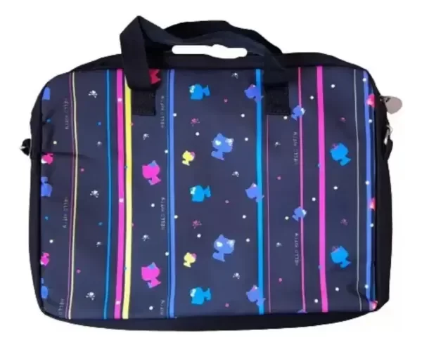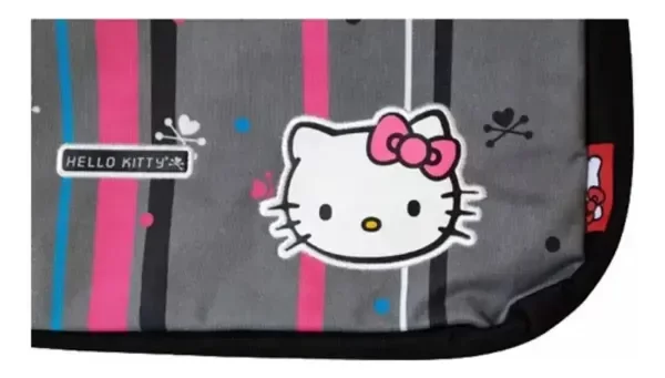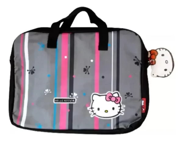 HELLO KITTY - PORTANOTEBOOK - ORIGINAL BY SANRIO - MEILY FOOTY, poliester/pvc, 2 asas de mano, correas con regulador de medida y ganchos de metal, cierre con detalle de kitty de metal, cara y nombre de hello kitty bordada en el frente, medidas aproximadas y peso : 29 x 35 cm, 250 grs.