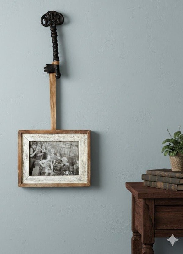 PORTARRETRATO DE PARED - METAL Y MADERA - N* 1080, llave de metal envejecida, portarretrato de madera, medidas: largo total 57 cm - llave 23 cm - portarretrato 18 x 23 cm - peso: 700 grs.