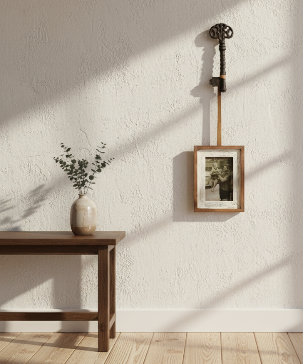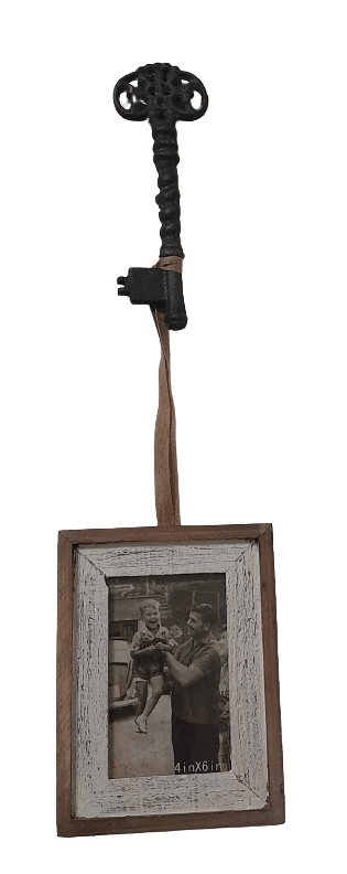 PORTARRETRATO DE PARED - METAL Y MADERA - N* 1079, llave de metal envejecida, portarretrato de madera, medidas: largo total 59 cm - llave 23 cm - portarretrato 21 cm - peso: 750 grs.